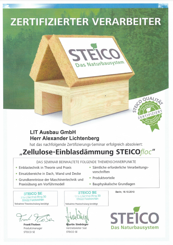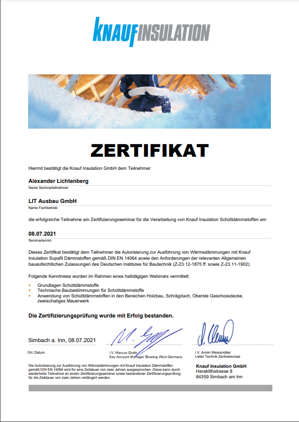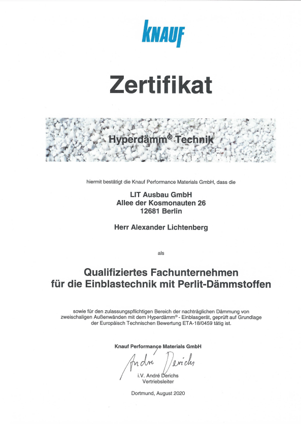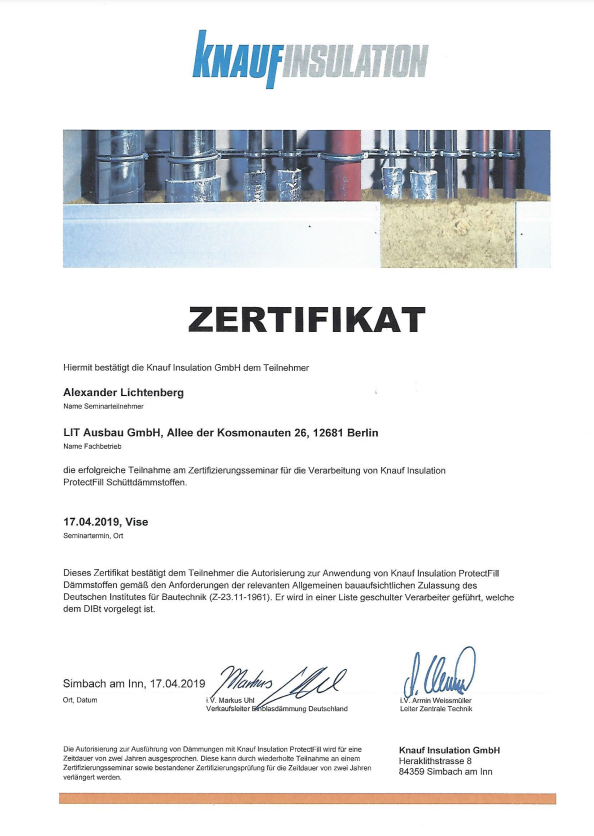 AUSGEZEICHNET Basierend auf 39 Bewertungen Fares GetzinTrustindex überprüft, ob die Originalquelle der Bewertung Google ist. Ich habe den Dachstuhl meines MFH mit einer Einblasdämmung versehen lassen. Die Arbeiten wurden zügig wie vereinbart durchgeführt. Herr Lichtenberg und sein Team waren sehr kompetent und freundlich! Rick CzajaTrustindex überprüft, ob die Originalquelle der Bewertung Google ist. Wir haben gerade ein Bungalow mit Satteldach ohne Dachboden kernsaniert. Nachdem wir fertig waren und der Innenausbau schon weit vorangeschritten war, zerstörte ein Marder eine beträchtliche Fläche der neu verbauten Holzfaserdämmung im Bereich zwischen den Sparren. Bauartbedingt war eine Reparatur nicht oder nur durch untragbar finanziellem Mehraufwand möglich. Die Dacheindeckung war erfolgt und wir wohnten bereits im Haus. Zugleich war die Fassadendämmung in vollem Gange. Auf der Suche nach einer Lösung kontaktierte ich mehrere Unternehmen, welche mir reihenweise und aus verschiedenen Gründen Absagen erteilten. Eines dieser Unternehmen jedoch verwies auf die Firma LIT-Ausbau. Ich rief daraufhin den Ansprechpartner Eddie Wissmann an und schilderte meine Problematik. Eddie hat sich von mir ein paar Bilder schicken lassen und sich mit einem kurzfristigen vor Ort Termin bei mir gemeldet. Nachdem feststand, dass das Einbringen der Einblasdämmung wirklich schwierig aber möglich ist (alles, bis auf den Flur, musste von außerhalb des Gebäudes erfolgen), wurde ich noch umfassend zu den verschiedenen Dämmmaterialen beraten, mit den dazugehörigen Datenblättern versorgt und ich bekam ein Angebot per Mail. Am Tag der Leistungserbringung kam das Unternehmen gut gelaunt und pünktlich bei mir an und ging nach kurzer Vorbesprechung ans Werk. Es handelte sich dabei um einen Samstag, welcher mir aufgrund meines Termindrucks durch andere Gewerke und dem vollen Terminkalender des Unternehmens von LIT angeboten wurde, da die Aussendämmung weitergehen sollte und das den Einblasbereich verschlossen hätte. Das ist heutzutage auch alles andere als selbstverständlich - aber dazu später mehr. Am Ende des Tages waren 100qm Zwischendecke gedämmt und an kritischen Stellen wurde für mich kostenneutral mehr Material eingebracht, weil man nicht nur den Auftrag erledigen, sondern auch ein perfektes Ergebnis erzielen wollte. Nach Abschluss jeder Einblassituation, wurden mir Fotos der erfolgten Dämmung gezeigt und sich nach meiner Zufriedenheit erkundigt. Von Erstkontakt bis Abschluss der Arbeiten vergingen 8 Tage. Leute, die ebenfalls gerade bauen oder sanieren, dürften einschätzen können, was das für eine unglaubliche Leistung ist. Darüberhinaus waren auch alle anderen Faktoren wie Kommunikation, Preis, Verlässlichkeit, Sauberkeit und natürlich das Ergebnis außerordentlich. Ich bin LIT-Ausbau unendlich dankbar, da sie diesen Schaden so vollumfänglich behoben und dabei durch die komplett lückenlose Dämmung ein noch besseres Resultat erzielt haben. Und das komplett ohne die im Handwerk leider oft anzutreffende Überheblichkeit und Arroganz. Nachbrenner: Da sich durch den Schaden und dessen Behebung durch die Einblasdämmung das Dach in ein Kaltdach änderte, musste eine Trochenbau-Innenwand nachträglich nach oben hin geschlossen werden, da der obere Teil außerhalb der neuen Dämmebene lag. Also habe ich wieder Eddie Wissmann kontaktiert, mich beraten lassen und das Unternehmen kam nach einem Termin in meiner Wohngegend kurzerhand vorbei und verfüllte die Innenwand ebenfalls von außen und zu einem unschlagbaren Preis. Hätte ich vorher über die Möglichkeiten der Einblasdämmung gewusst, dann hätte ich mir sehr viel Arbeit, Frust und Geld gespart und gleich alles von LIT machen lassen. Es geht - selbst in Eigenleistung - nicht besser, schneller oder sogar günstiger. Vielen, vielen Dank! Thomas von GizyckiTrustindex überprüft, ob die Originalquelle der Bewertung Google ist. Top Service und schnelle Reaktion auf Nachfragen. Hervorragendes Preis-Leistungsangebot. Crisu CrisuTrustindex überprüft, ob die Originalquelle der Bewertung Google ist. Hat alles super geklappt Frank KarliczekTrustindex überprüft, ob die Originalquelle der Bewertung Google ist. Zuverlässig, kompetent, professionell. Klare Weiterempfehlung! R. B. C. SeemannTrustindex überprüft, ob die Originalquelle der Bewertung Google ist. Wir sanieren gerade ein denkmalgeschütztes Haus aus den 30er Jahren. Da das Mauerwerk doppelwandig ist, die Fassade erhalten bleiben soll und eine Innendämmung viele Folgegearbeiten und verkleinerte Räume nach sich gezogen hätte, bot sich die Einblasdämmung als effektive und im Vergleich preiswerte Lösung an. Die Fa LIT Ausbau GmbH kann ich hierfür ohne irgendwelche Abzüge weiterempfehlen. Von der Angebotsstellung über die Ausführung der Einblasdämmung bis zur Rechnung war alles perfekt. Die Kommunikation war sehr gut, unsere Fragen wurden immer schnell und freundlich beantwortet. Es war auch die einzige von uns angeschriebene in dem Bereich tätige Firma, die nicht nur das LV ausgefüllt, sondern die Baustelle im Vorab auf Geeignetheit besichtigt hat. Vielen Dank! H. WiterTrustindex überprüft, ob die Originalquelle der Bewertung Google ist. Wir haben 2024 unser 30er Jahre Einfamilienhaus kernsaniert. In diesem Kontext haben wir uns dafür entschieden, das zweischalige Mauerwerk mit Einblasdämmung zu füllen um den Dämmwert der Gebäudehülle zu verbessern. Wir haben bei mehreren Berliner Firmen aus dem Bereich angefragt. Alle - außer LIT - haben abgewunken, da zweischaliges Mauerwerk für unser Baujahr und unsere Gegend unüblich sei. LIT hat dennoch angeboten, kurzfristig vorbeizukommen um Probebohrungen vorzunehmen. Und zu aller Überraschung hatten wir tatsächlich zweischaliges Mauerwerk. Herr Wissmann hat daraufhin das Vorgehen erläutert und ein Angebot geschrieben und wir haben zeitnah den Auftrag erteilt. Die Zusammenarbeit lief äußerst gut und wir hatten 